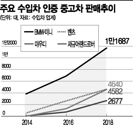실제 BMW의 경우 2014년 인증 중고차 판매량이 3820대에서 2018년 1만1687대로 뛰었고, 벤츠는 같은 기간 550대에서 4640대로 늘었다. 같은 기간 아우디는 0대에서 4582대로, 재규어랜드로버는 61대에서 2677대로 증가했다.