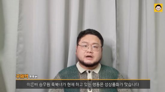 유튜버 구제역은 19일 '승무원 룩북녀를 성매매특별법 위반으로 고발했습니다'라는 제목의 영상을 게재하며 "'승무원 룩북녀'가 현재 하는 행동은 성 상품화가 맞다. 그냥 성 상품화가 아니고 성매매특별법에 위반될 우려가 있다"고 지적했다.