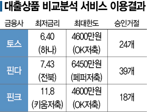 금리와 한도는 플랫폼별로 차이가 있었지만 거절을 통보한 금융사는 모두 수십 곳에 달했다. 핀크는 18개, 토스와 핀다는 각각 24개, 39개 금융사가 대출이 어렵다고 안내했다. 대출거절은 고신용자를 상대로 영업하는 시중은행과 중·저신용자를 상대하는 2금융권에서 골고루 이뤄졌다. 핀크에서는 지방은행과 우리카드, SBI저축은행 등이, 토스는 신한·우리·SC제일은행과 KB·NH·상상인저축은행에서 대출을 거절했다. 핀다에서도 저축은행과 온투업체 카드사들이 대출을 거절했다.
