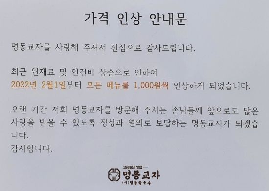 명동교자 측은 "원재료비와 인건비 등 각종 비용 상승에 따른 조치"라고 설명했다.