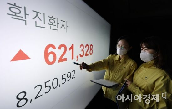 코로나19 신규 확진자가 처음으로 60만명을 넘어선 17일 서울 송파구청 상황실에서 직원들이 신규 확진자 숫자를 파악하고 있다. 중앙방역대책본부에 따르면 이날 0시 기준으로 신규 확진자는 62만 1328명으로 집계됐다. 위중증 환자는 1159명, 사망자 수는 429명이다./김현민 기자 kimhyun81@약국은 감기약·해열제 재고 바닥
