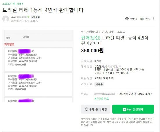 중고나라 등 거래 사이트에는 브라질전 입장권을 양도·판매한다는 글이 끊임없이 올라오고 있다. 한 페이지 전체가 브라질전 입장권 판매 게시글로 도배될 정도다. 6만원 짜리 2등석A 입장권 2장이 25만원에, 15만원 짜리 1등석A 입장권 4연석은 140만원(장당 35만원)에 판매되고 있다. 3만5000원짜리 레드존 입장권을 35만원에 올린 판매자까지 등장했다. 이들은 입금 확인 후 모바일티켓 선물하기 기능으로 입장권을 보내준다고 설명하고 있다.