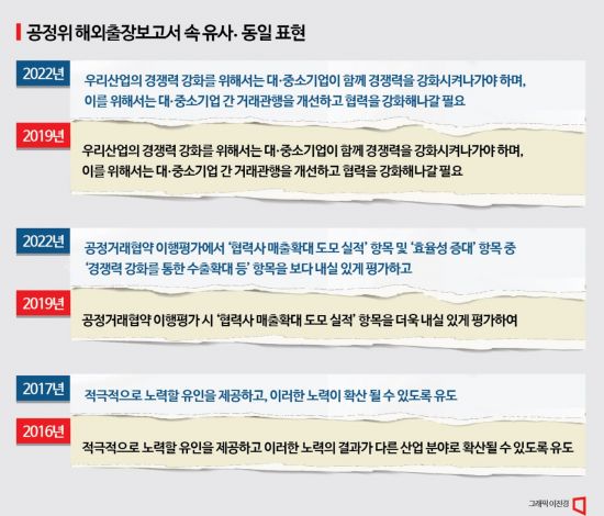 정책적 시사점에서도 완전히 일치하는 문구가 발견됐다. 공정위 직원들은 출장 후 ‘공정거래협약 이행평가에서 ‘협력사 매출확대 도모 실적 항목을 보다 내실 있게 평가’하자고 제안했다. 하도급 문제의 해결법으로 내놓은 방안인데 2019년 미국을 다녀와 쓴 보고서에도 같은 제안이 있다.