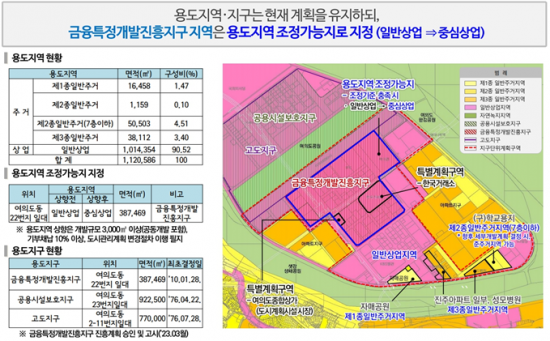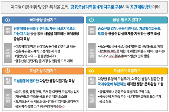 이를 위해 시는 여의도 지역 이용현황 및 입지특성을 고려하여 지구단위계획구역을 4개 지구(국제금융중심지구, 금융업무지원지구, 도심기능지원지구, 도심주거복합지구)로 구획해 각 구역에 적합한 공간계획방향을 마련하고, 건축물의 용적률·높이·용도 등 전체적인 공간을 구상했다.