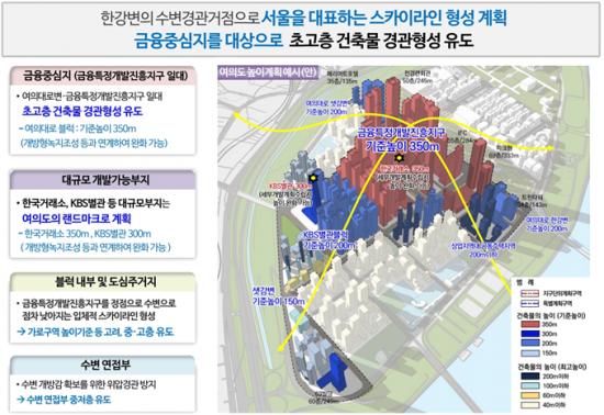 이외에도 한강변의 상징적인 경관 거점으로서 금융특정개발진흥지구(금융중심지)를 중심으로 초고층 건축물을 유도하고 입체적인 경관을 형성하기 위해 창의·혁신 디자인을 도입하여 세계적인 수변 도시경관 창출이 가능하도록 한다는 방침이다. 금융특정개발진흥지구를 중심으로 350m 이상의 초고층 건축물을 유도하고 높이를 추가로 더 완화할 수 있도록 했다. 현재 여의도 최고층 빌딩인 파크원이 333m임을 감안하면 금융특정개발진흥지구 내에서는 높이규제는 사실상 폐지한 것이다.