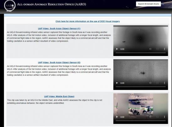 미국 정부가 조사한 UFO 신고 영상. [이미지출처=AARO]AARO는 이 홈페이지를 통해 조사가 완료된 UAP 사건에 대한 정보, 사진, 영상 등을 공개할 계획이다. 현재 홈페이지에는 국방부가 지난 4월 의회 청문회 때 공개한 자료와 UAP 신고 영상 등 8건이 올라와 있다.