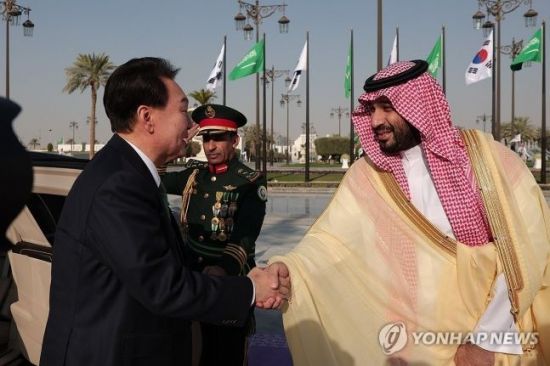 사우디아라비아를 국빈 방문 중인 윤석열 대통령과 부인 김건희 여사가 22일(현지시간) 리야드의 야마마궁에서 열린 공식 환영식에서 무함마드 빈 살만 빈 압둘아지즈 알 사우드 왕세자 겸 총리의 영접을 받고 있다. [사진출처=연합뉴스]'실질적 경제 협력', 공동성명 가장 큰 축… 상호 투자 확대 위한 양국 기업·투자자 지원키로