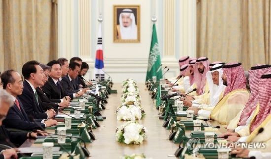 윤석열 대통령과 무함마드 빈 살만 빈 압둘아지즈 알 사우드 왕세자 겸 총리는 24일(현지시간) 양국 관계의 발전 방향과 지역 및 국제 현안에 대한 협력 의지를 담은 '한-사우디 공동성명'을 발표했다. 1980년 5월 최규하 대통령의 사우디 방문 이래 43년 만에 채택된 공동성명으로 당시 나온 공동성명은 12개 조항, 2019년 공동 언론발표문도 19개 조항에 불과했다.