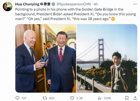화 대변인은 이날 자신의 소셜미디어 X(옛 트위터)에 이 같은 일화를 적었다. 게시글에 따르면 바이든 대통령은 자신의 휴대폰을 시 주석에게 내밀며 "이 청년이 누군지 아느냐"고 물었고, 휴대폰 속에는 1985년 미국을 방문해 샌프란시스코 금문교(골든게이트브리지)를 배경으로 찍은 사진이 있었다. 시 주석은 이에 웃어 보이며 "안다, 38년 전의 일"이라고 답했다.