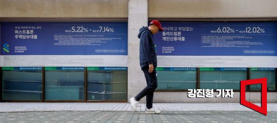 최근 국내 시장금리와 은행권 대출금리가 빠르게 상승하고 있는 23일 서울 한 시중은행 외벽에 대출 금리가 적힌 현수막이 걸려 있다. 사진=강진형 기자aymsdream@은행의 가계·대출 연체율 뿐 아니라 신용카드 대출 연체율이 크게 뛴 것으로 나타났다.