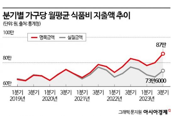물가 변동의 영향을 제외한 작년 3분기 가구당 실질 식품비 지출액도 73만6026원으로 2분기 대비 7.1% 증가했다. 이계임 한국농촌경제연구원 연구원은 “가구의 명목 식품비 지출액과 실질 식품비 지출액은 2019년 1분기부터 2021년 1분기까지 유사한 추이를 보이다가 이후 점점 격차가 커지는 모습을 보이고 있다”며 “이는 식품 소비자물가지수가 2021년 1분기 이후부터 2023년까지 지속적으로 증가했기 때문”이라고 설명했다.