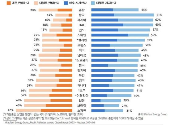래디언트 에너지 그룹의 원자력 발전에 관한 20개국 대중의 인식 조사 결과[이미지출처=에너지정보문화재단 제공, 연합뉴스]조사 대상 20개국 중 일본, 브라질, 스페인 3국을 제외한 17개국에서는 원전 지지 비율이 더 높았다. 일본은 후쿠시마 원전 사고로 인해 원전 지지(29%)보다는 반대(40%) 여론이 더 높게 나타났다. 반면 중국(61%), 러시아(60%), UAE(60%), 인도(57%)에서는 지지 비율이 반대 비율보다 3배 이상 높았다. 또 스웨덴(56%), 필리핀(52%), 프랑스(50%)에서도 지지 비율이 50%를 넘어섰다.