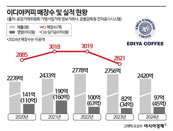 하지만 실제로 운영 중인 매장 수는 이보다 훨씬 적다. 폐점이 신규 개점을 앞지른 탓이다. 공정거래위원회 가맹사업거래 정보공개서에 공개된 이디야커피의 매장 수(가맹점+직영점)는 2020년 2885곳에서 2021년 3018곳, 2022년 3019곳으로 꾸준히 늘다가 2023년엔 2821곳으로 6.6% 감소했다. 지난해 매장 수는 아직 공개되지 않았다.